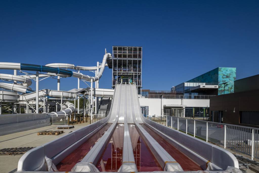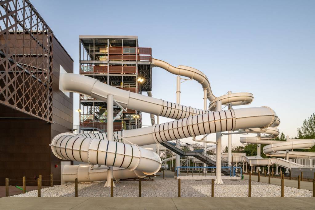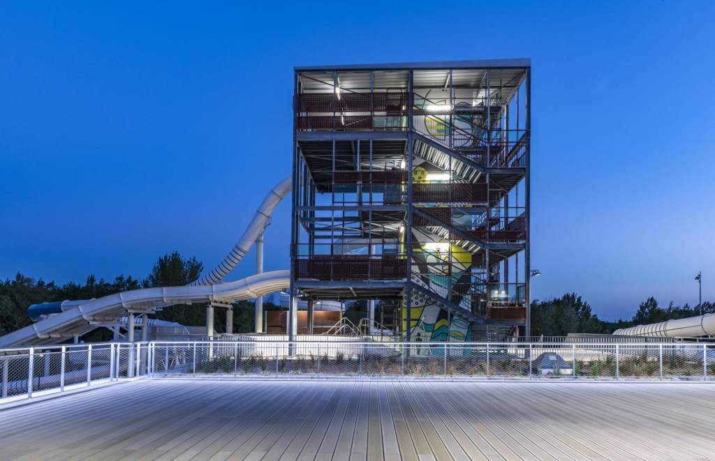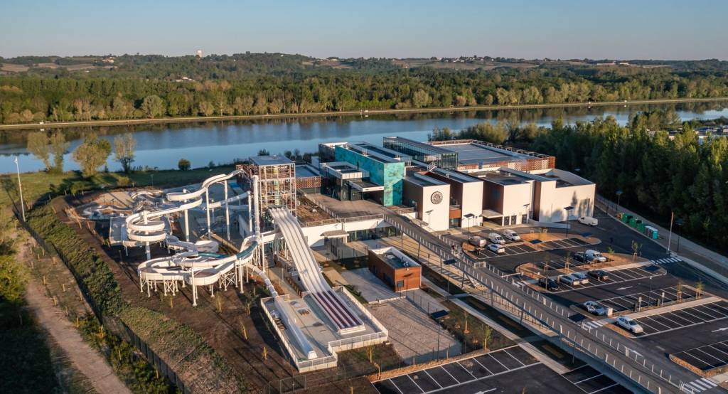 - 1 parc aquatique extérieur avec bassin de loisirs (500 m2), tour de glisse multi-toboggans, aire de jeux d’eau